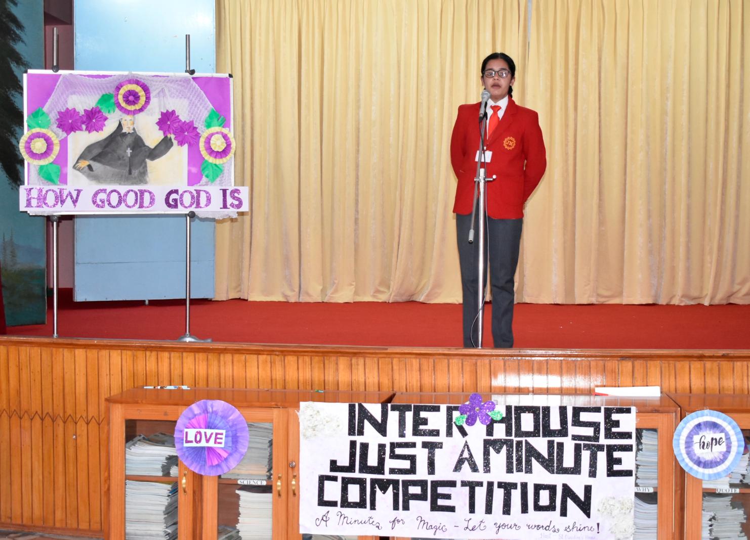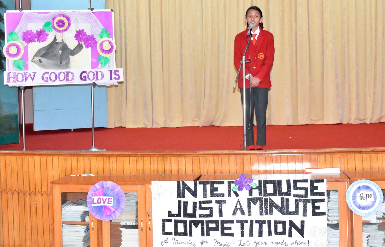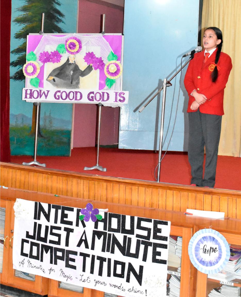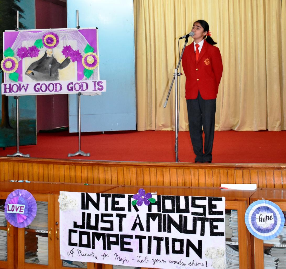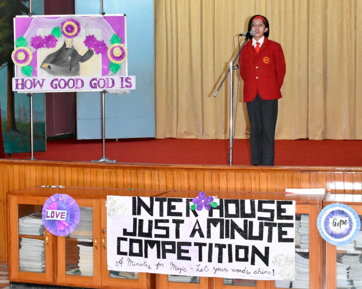 Description: An Inter-House Just-a-Minute competition was held on 26th July on the theme “Living the Values of St. Claudine Thévenet” to inspire students with her legacy of compassion, forgiveness, and faith. Participants from Grades VI, VII, and VIII spoke passionately about values such as love for the poor, resilience in suffering, and the power of forgiveness. Each student reflected on how these values can be practiced in daily life. The competition encouraged confident expression and a deeper understanding of St. Claudine’s mission. St. Joseph House emerged as the winner in all three categories. The event was a meaningful blend of spirituality, expression, and moral learning, resonating with St. Claudine's values.