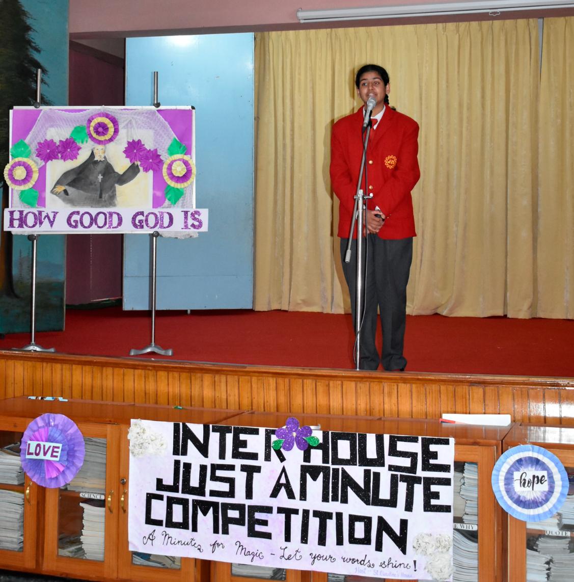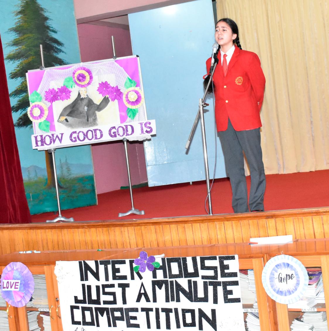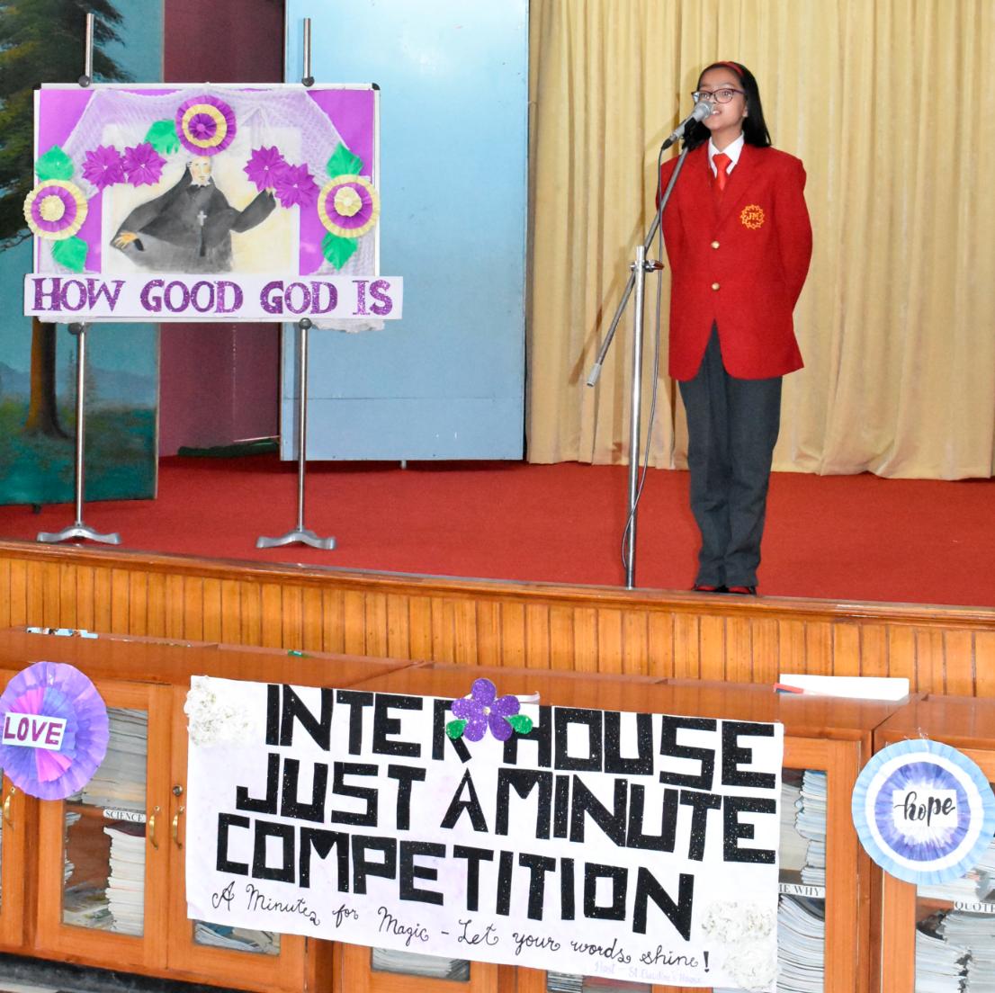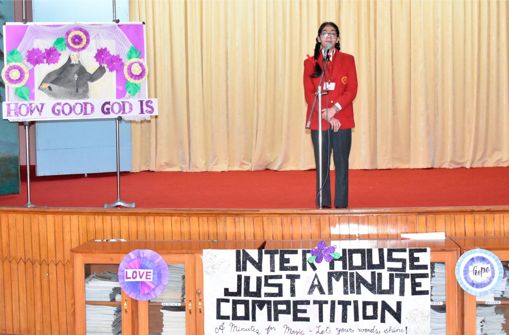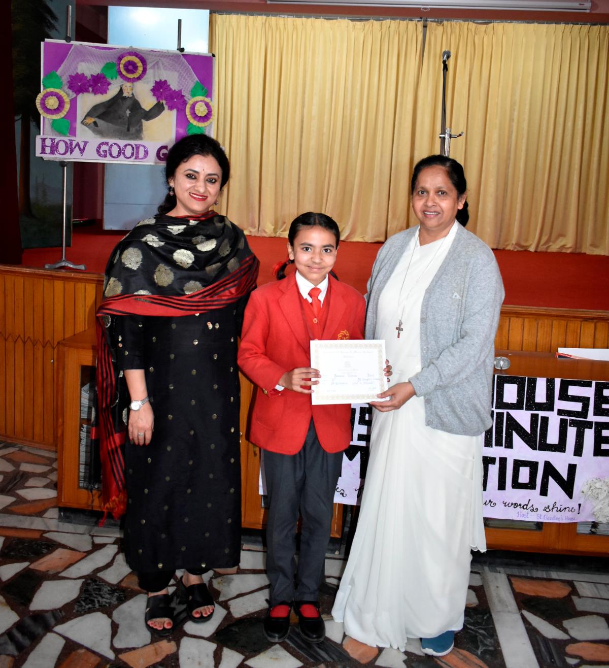Description: An Inter-House Just-a-Minute competition was held on 26th July on the theme “Living the Values of St. Claudine Thévenet” to inspire students with her legacy of compassion, forgiveness, and faith. Participants from Grades VI, VII, and VIII spoke passionately about values such as love for the poor, resilience in suffering, and the power of forgiveness. Each student reflected on how these values can be practiced in daily life. The competition encouraged confident expression and a deeper understanding of St. Claudine’s mission. St. Joseph House emerged as the winner in all three categories. The event was a meaningful blend of spirituality, expression, and moral learning, resonating with St. Claudine's values.