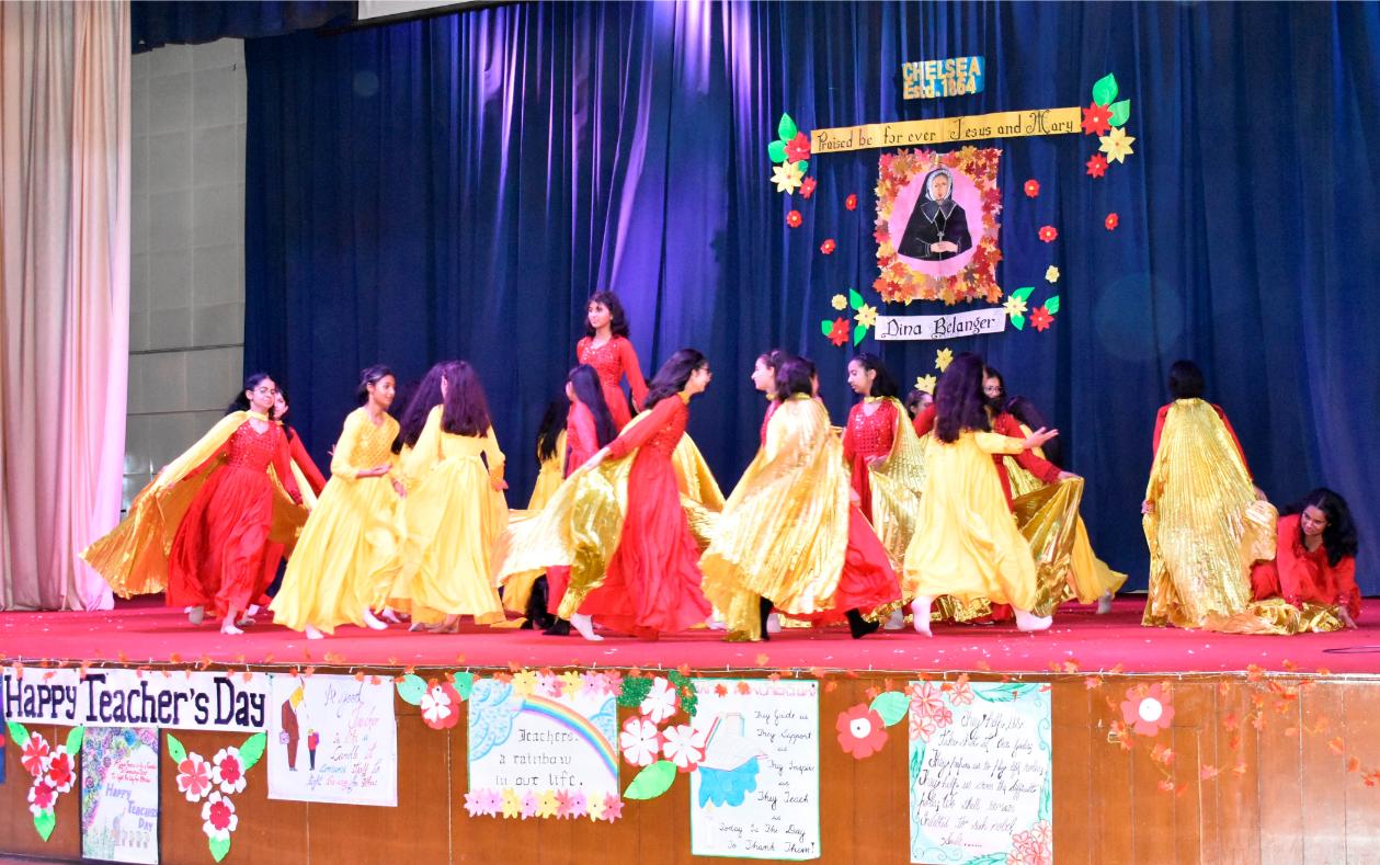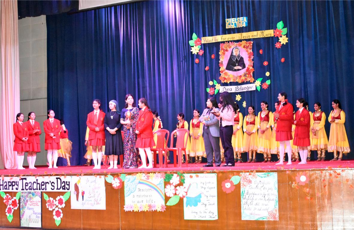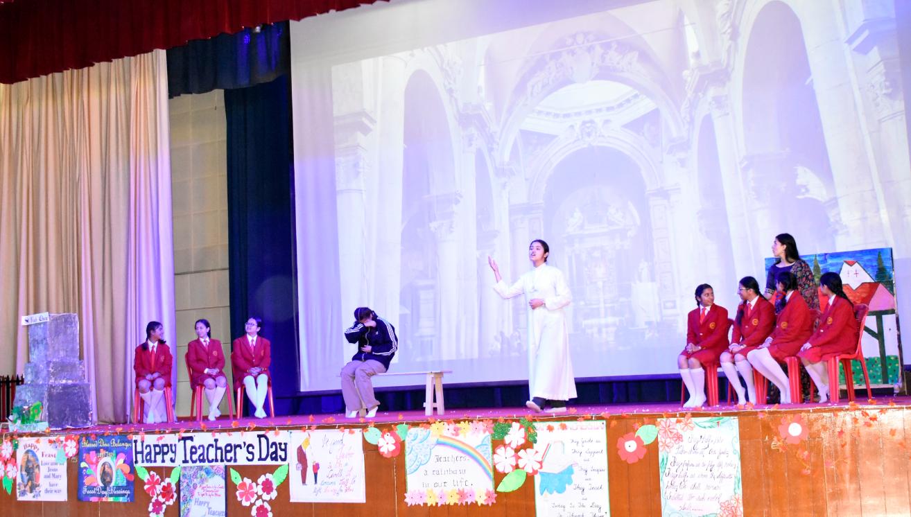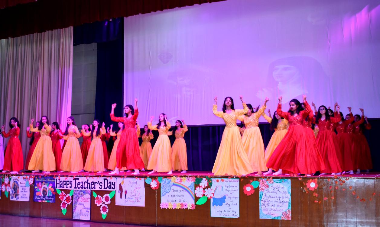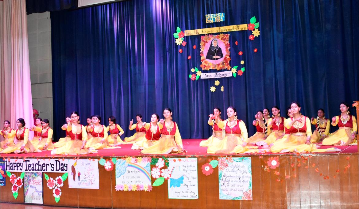 Description: Convent of Jesus and Mary, Chelsea Shimla celebrated Teacher’s Day with great joy and reverence on September 9, 2025, combining it with the feast celebration of Dina Belanger, a shining model of faith, love and sacrifice. The girls of Blessed Dina’s house hosted the event with great enthusiasm. The programme commenced with a melodious choir performance that set the tone of gratitude and devotion. A play on Dina Belanger was then staged portraying key moments of her life – her childhood, her passion for helping others, her unwavering devotion to Christ. The Teacher’s Day segment was filled with love and gratitude. Students offered cards as token of appreciation, and dedicated the play to their teachers’ tireless efforts in shaping students’ minds. To add vibrancy to the celebrations, students presented energetic classical and Bollywood dance that filled the auditorium with enthusiasm and appreciation. The event concluded with a heartfelt speech by Sister and a collective vote of thanks, where students acknowledged their teachers’ pivotal role in shaping their character.