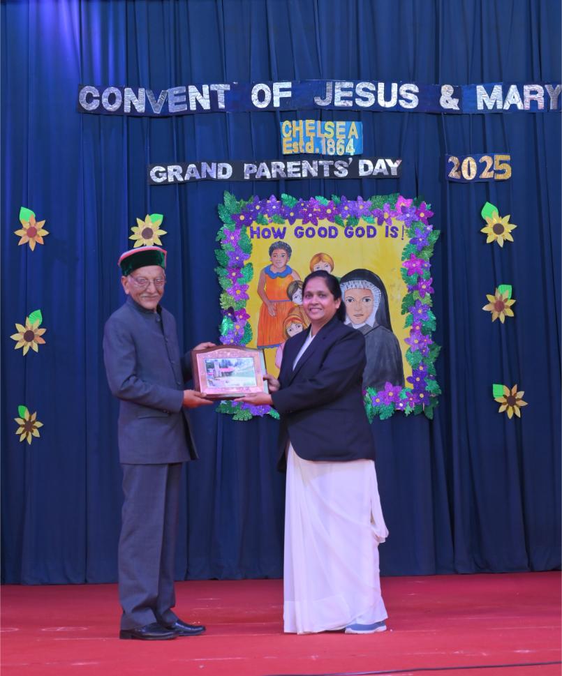 Description: Shimla, September 13: Convent of Jesus and Mary, Chelsea, Shimla, celebrated its Annual Day on the occasion of Grandparents’ Day with joy, reverence, and cultural vibrancy. The Chief Guest for the occasion was Mr. Suraj Prakash Ranta, Retired Assistant Commander, who was awarded the President’s Award for Meritorious Service by the Honorable President of India on Republic Day, 26th January 2013. The programme began with the introduction of the Chief Guest and the ceremonial lighting of the lamp, symbolizing the dispelling of darkness and the ushering in of knowledge. This was followed by a soulful prayer dance and a lively welcome song presented by the Kindergarten. The Principal, Sr. Greta addressed the gathering with her motivational words and PPT was presented showcasing the institution’s progress and commitment to holistic education. A special highlight of the day was a play on the life of Mother foundress, that was beautifully enacted by the Kindergarten children. Through their simple yet powerful performance, the little ones brought alive the values of faith, compassion, and service that guided the life of the Foundress. The cultural programme further sparkled with a series of colourful dances — a Retro Dance, a Modern Dance, and the traditional Himachali Nati by the tiny tots which enthralled the audience. In his address, Mr. Ranta commended the school for nurturing young talent with a fine blend of values and creativity. He emphasized the importance of cultural heritage, discipline, and family values, especially highlighting the irreplaceable role of grandparents in a child’s life. The Chief Guest was felicitated by the school as a mark of gratitude. The celebration concluded with a vote of thanks and the rendition of the School Anthem, leaving behind an atmosphere of pride, unity, and heartfelt appreciation for the guiding lights of every family — the grandparents.