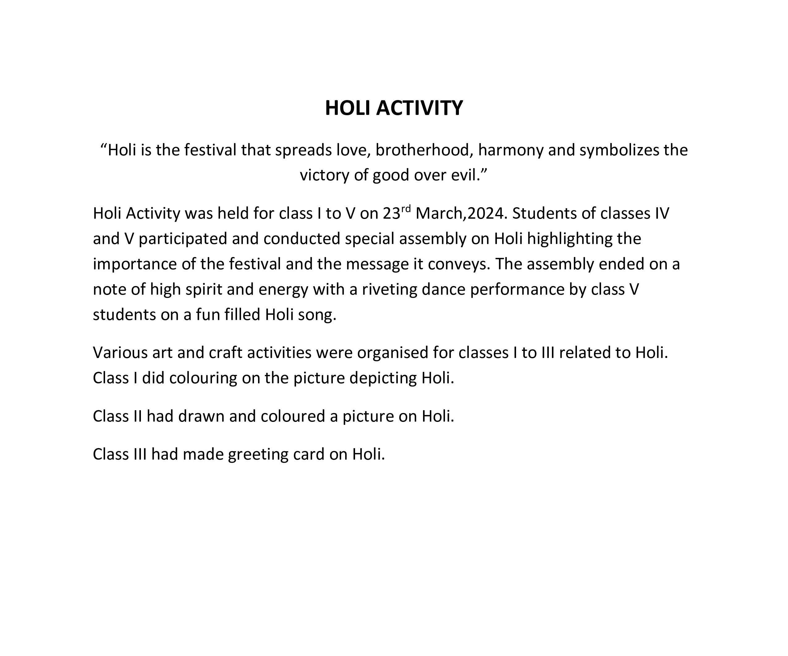 Description: A special assembly and an activity was conducted on 23rd March,2024 on the occasion of Holi for classes I-V.