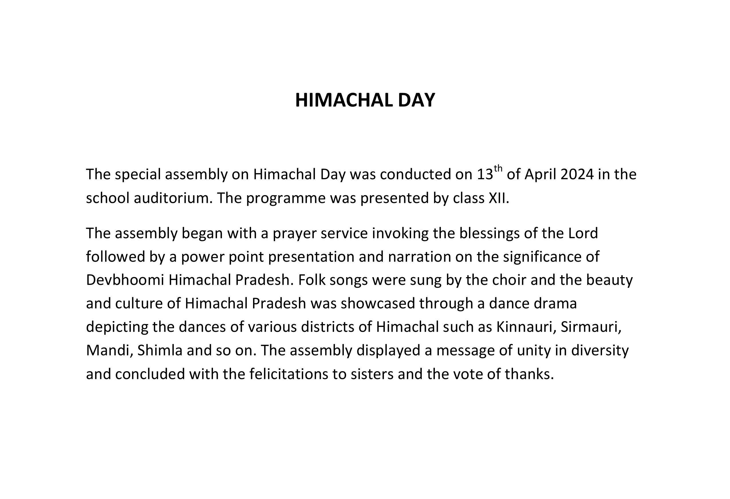 Description: On 13th April,2024 Himachal Day was celebrated in school auditorium.