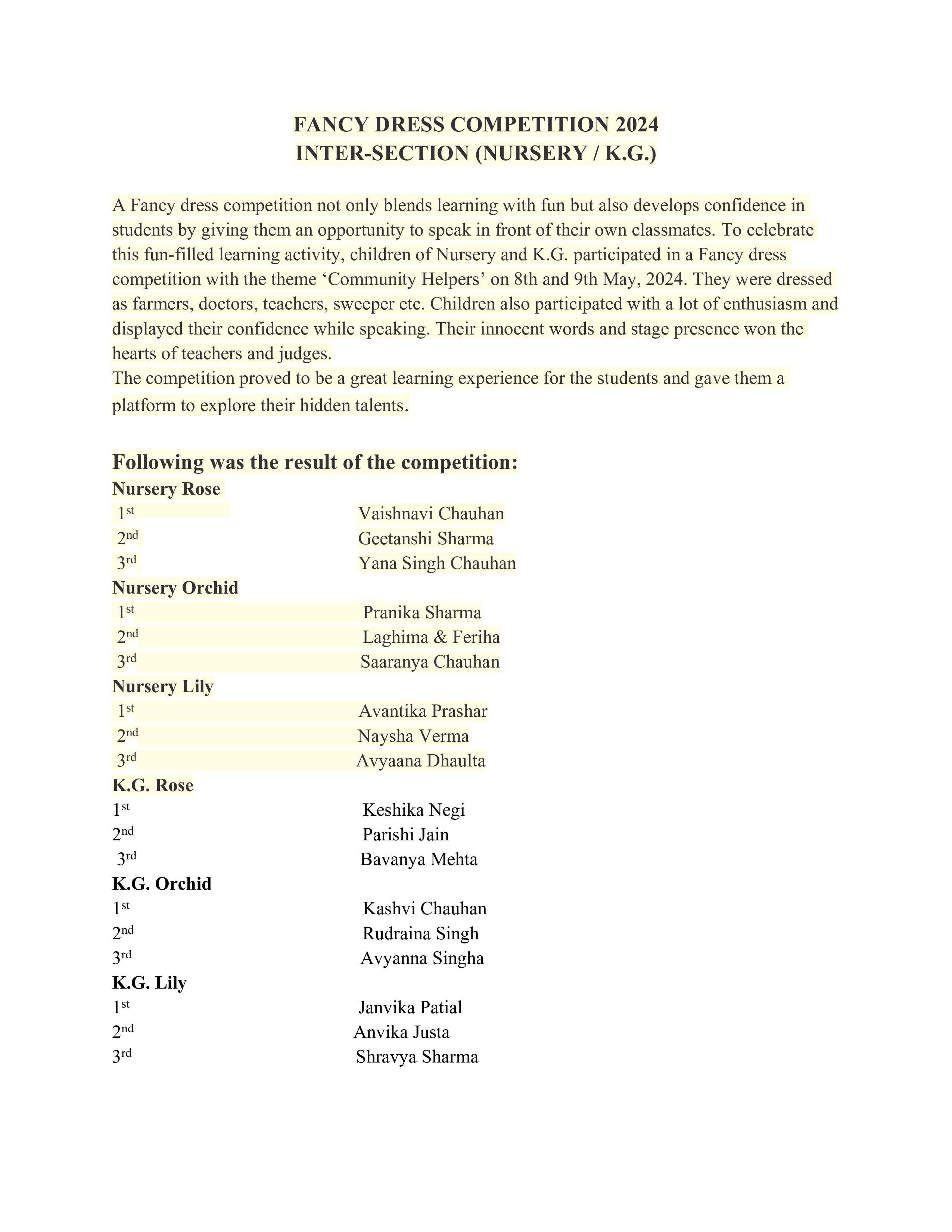 Description: An Inter-Section Fancy Dress Competition was held on 9th May, 2024 for classes Nursery and K.G.