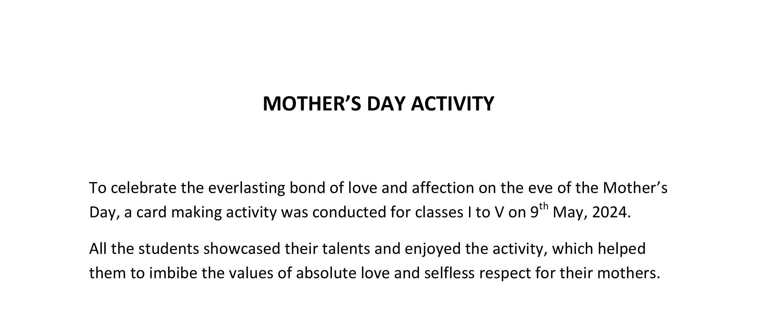 Description: On 9th May,2024 Mother's Day Activity was conducted for classes I-V.
