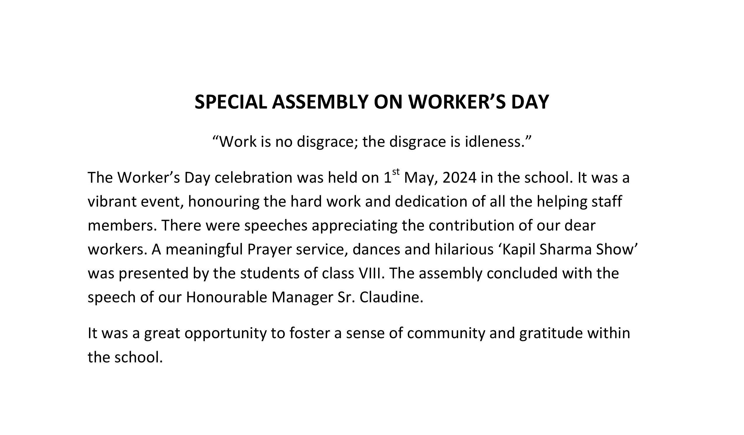 Description: On 1st May,2024 Worker's Day was celebrated in the school auditorium.