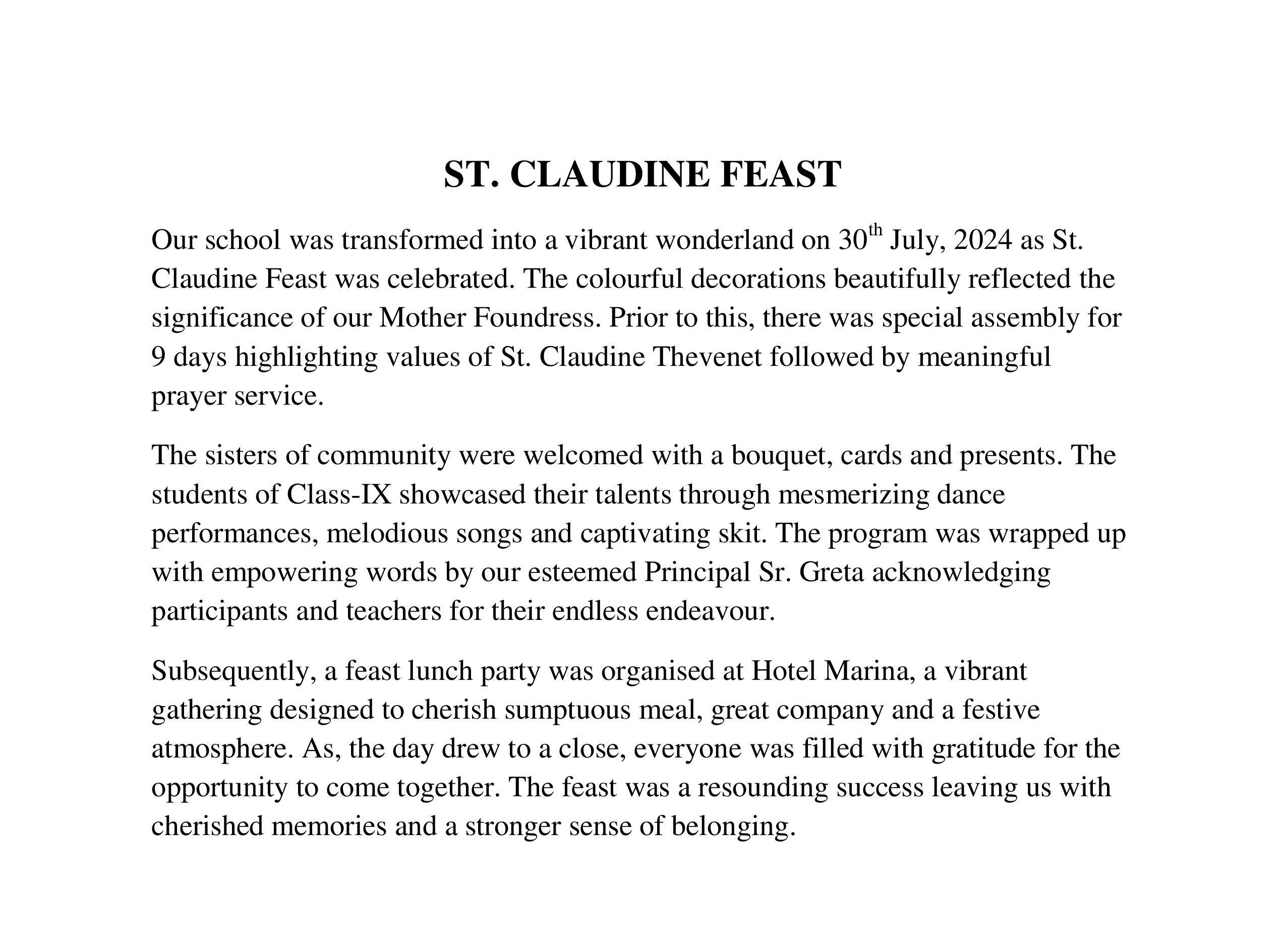 Description: On 30th July,2024 St. Claudine's Feast was celebrated in the school.