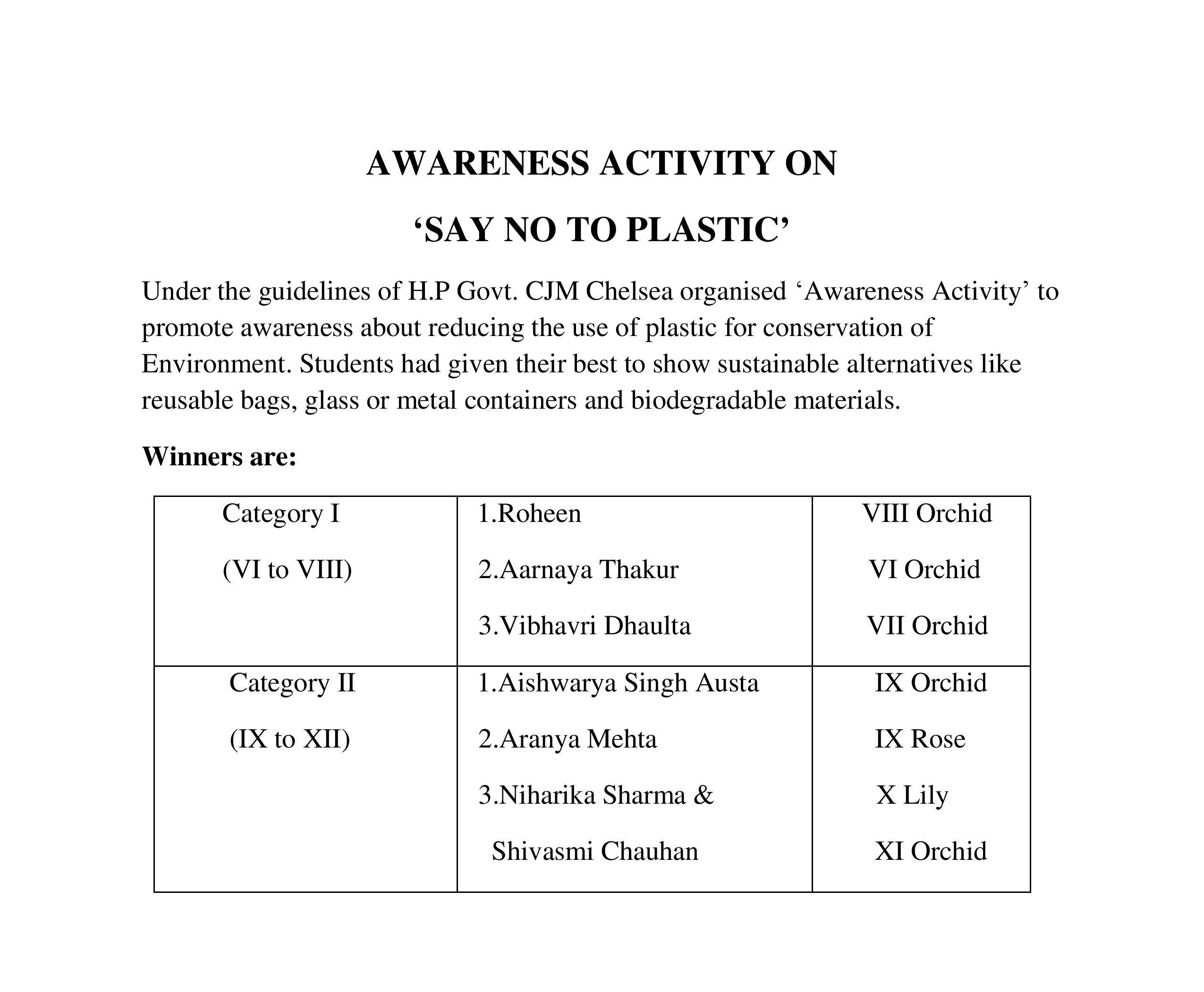 Description: On 10th August 2024, an Awareness activity related to 'Say No To Plastic' was conducted for classes VI-XII.