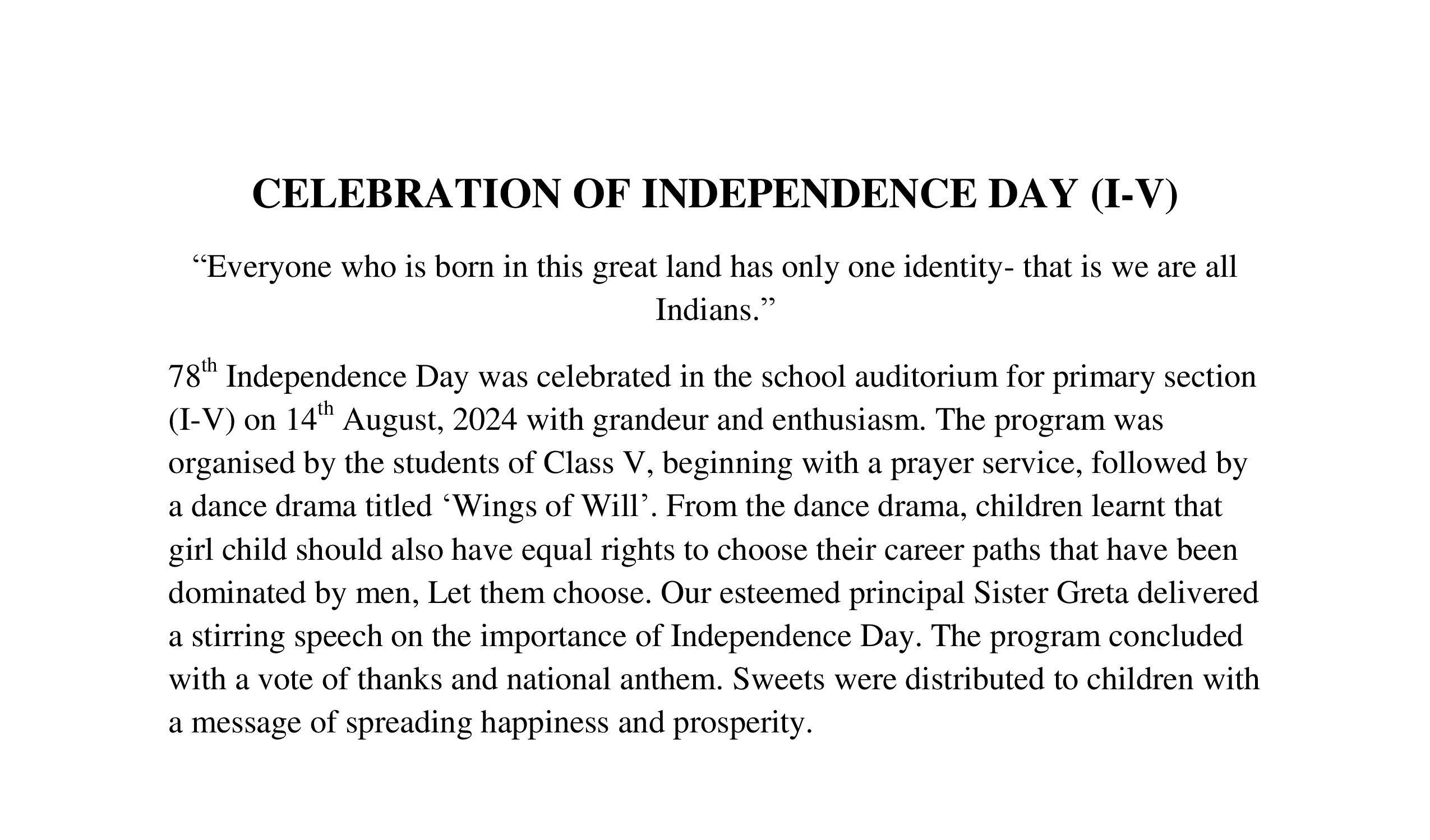 Description: On 14th August 2024, Independence Day was celebrated by classes I to V.
