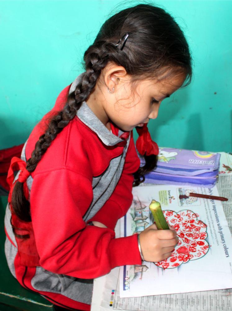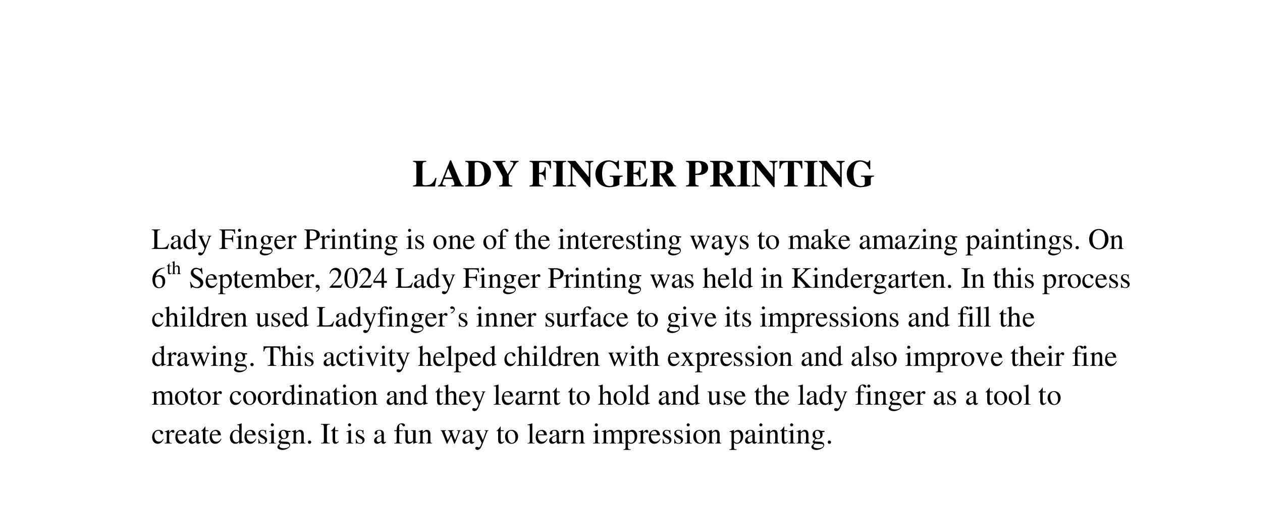 Description: On 6th September, 2024 Lady Finger Printing Activity was conducted for KG class.