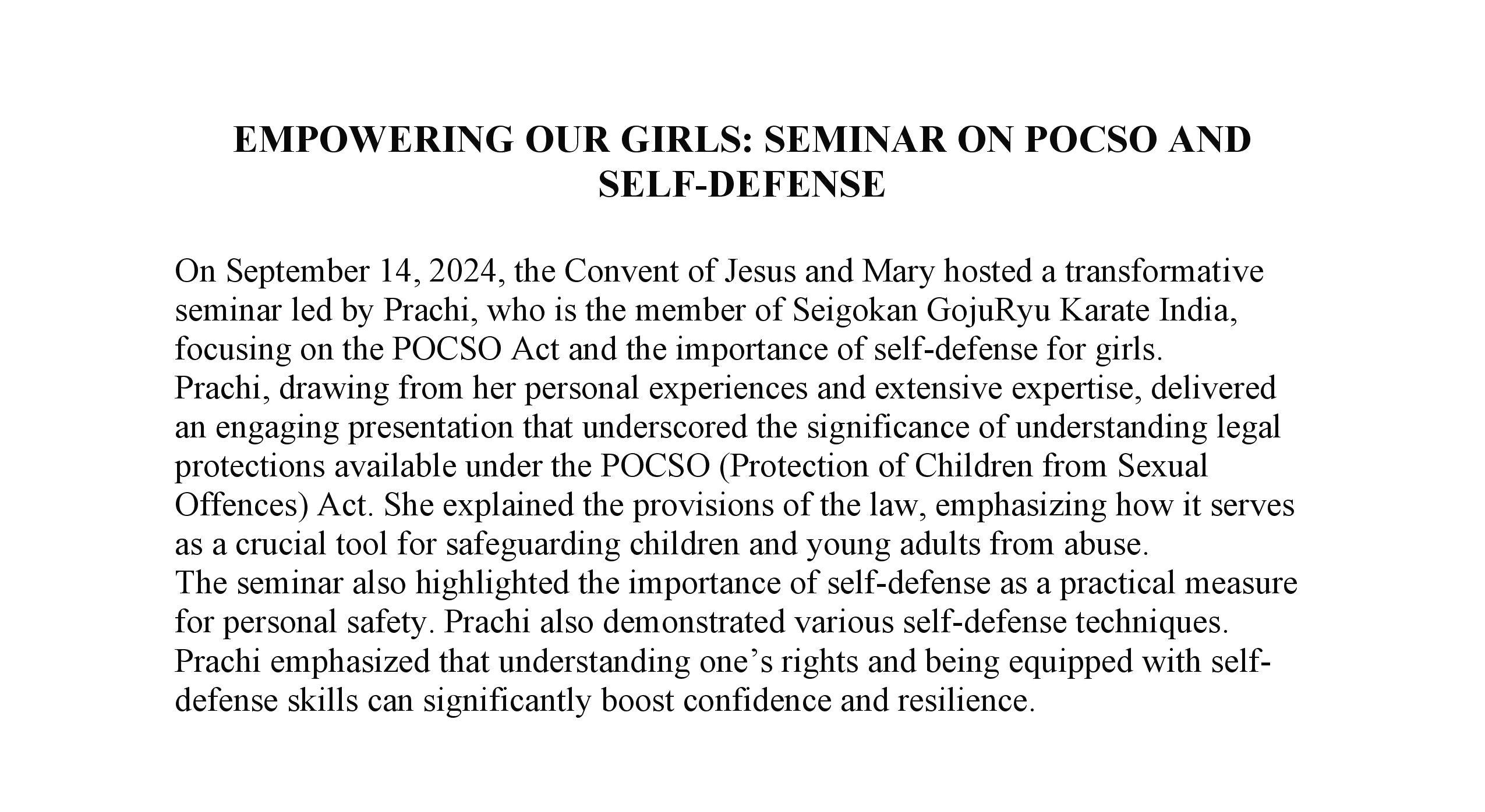 Description: On 14th September,2024 Seminar on POCSO and Self-Defense was organised in school.