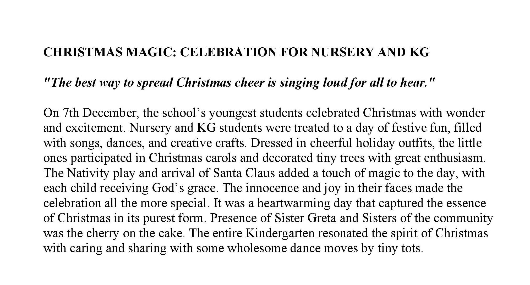 Description: On 7th December, 2024 Christmas celebration was done by class Nursery and KG.