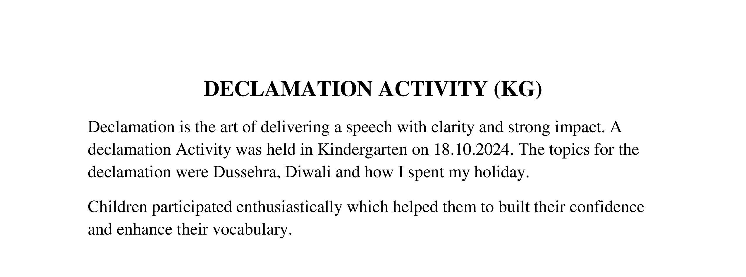 Description: On 18th October,2024 a declamation activity was conducted for KG class on various topics.