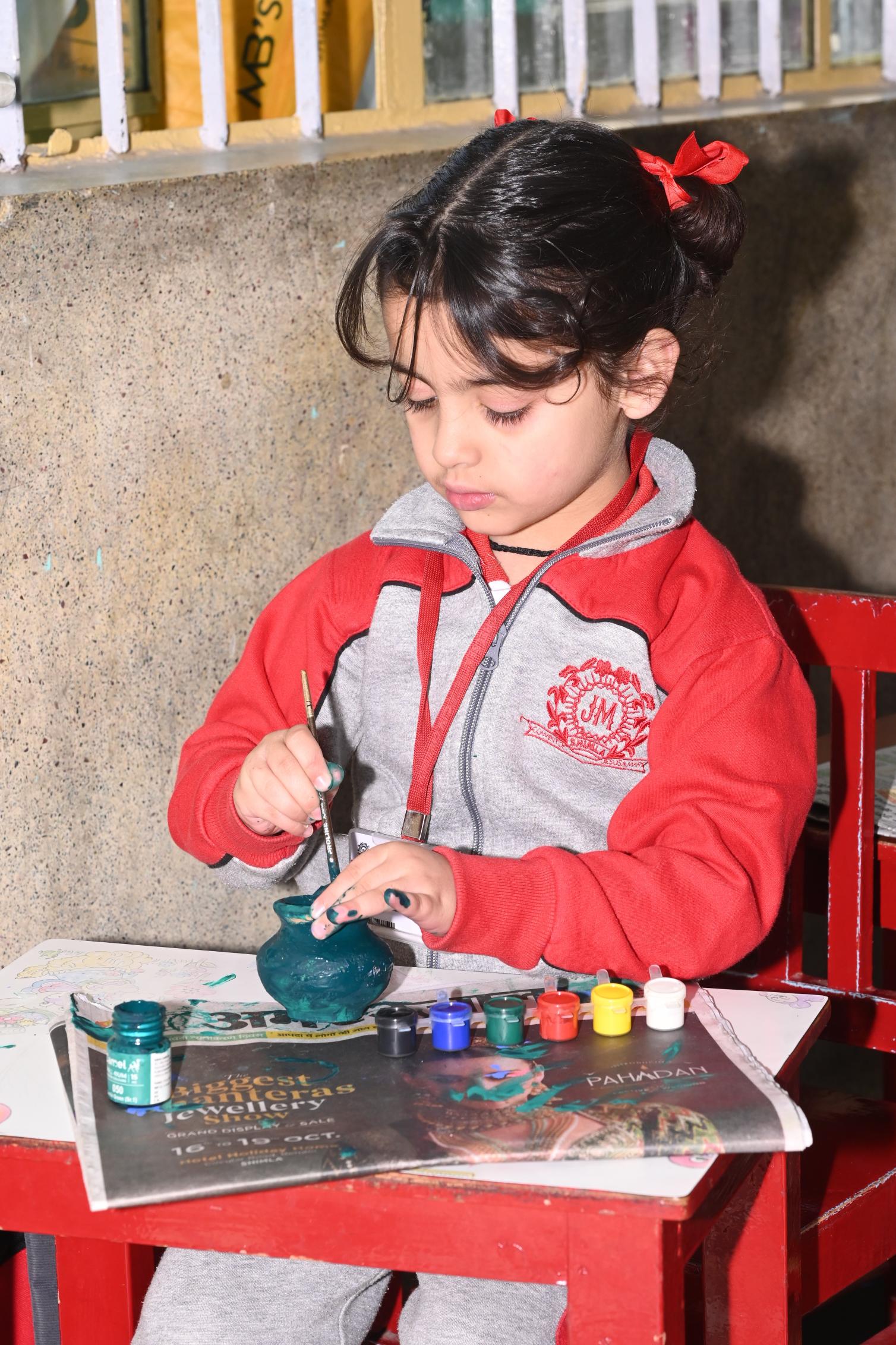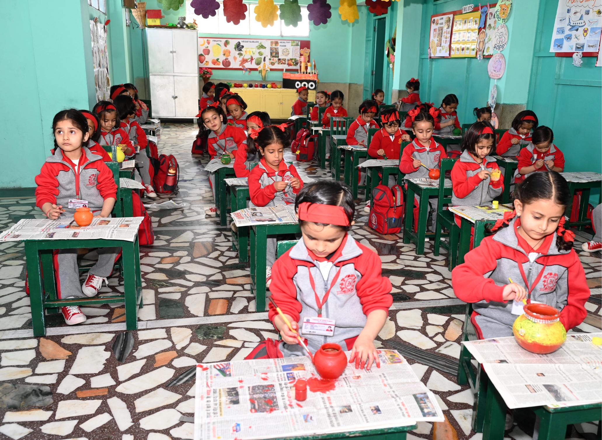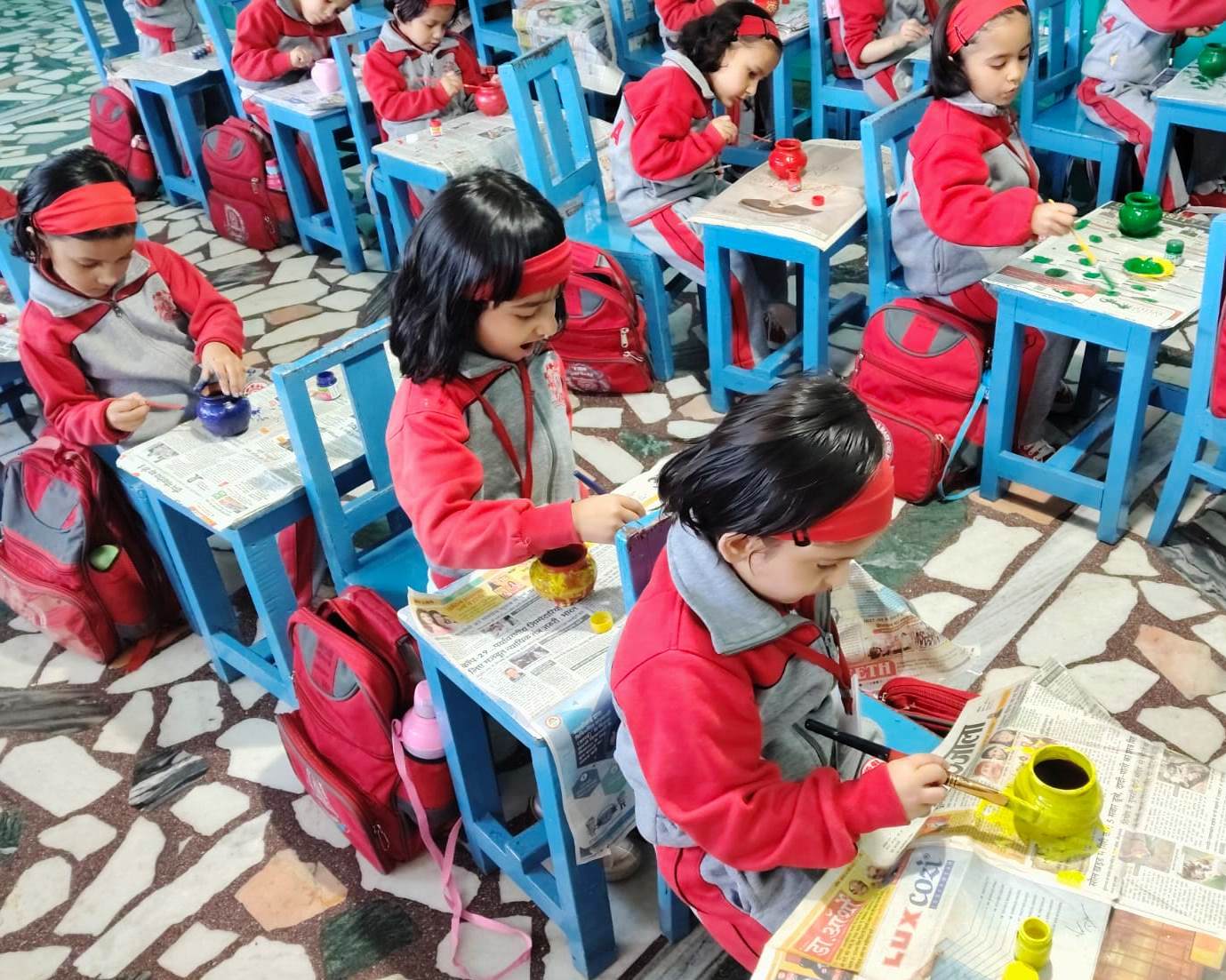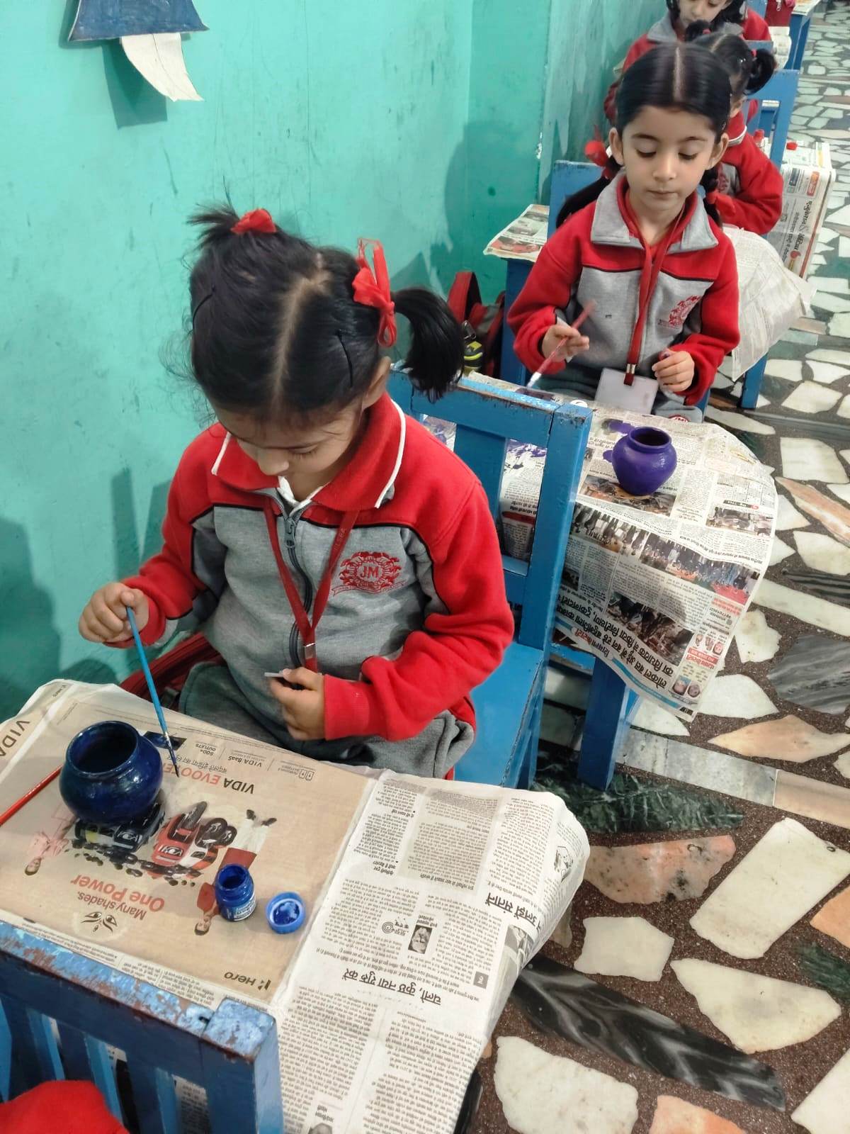 Description: “Creativity is intelligence having fun.” Painting opens a new play opportunity for the toddler keeping this in mind a class activity on Clay Pot Painting, Cone Painting, and Candle Decoration was conducted on 17 October, 2025 for the Kindergarten students. The activity aimed to enhance the children’s creativity, imagination, and fine motor skills through hands-on artistic expression. The little ones participated with great enthusiasm and excitement as they beautifully decorated their clay pots, cones, and candles using vibrant colours, glitter, and decorative materials. It was delightful to see their faces light up with joy and pride as they created their own masterpieces. Such creative activities not only nurture artistic talents but also help children develop patience, focus, and confidence. The day was truly filled with colours, fun, and festive cheer leaving behind wonderful memories of learning through art and creativity.
