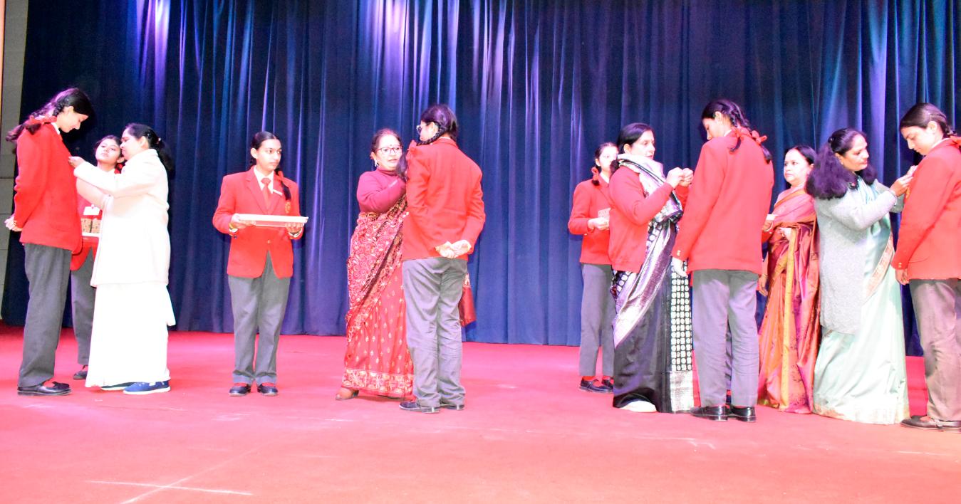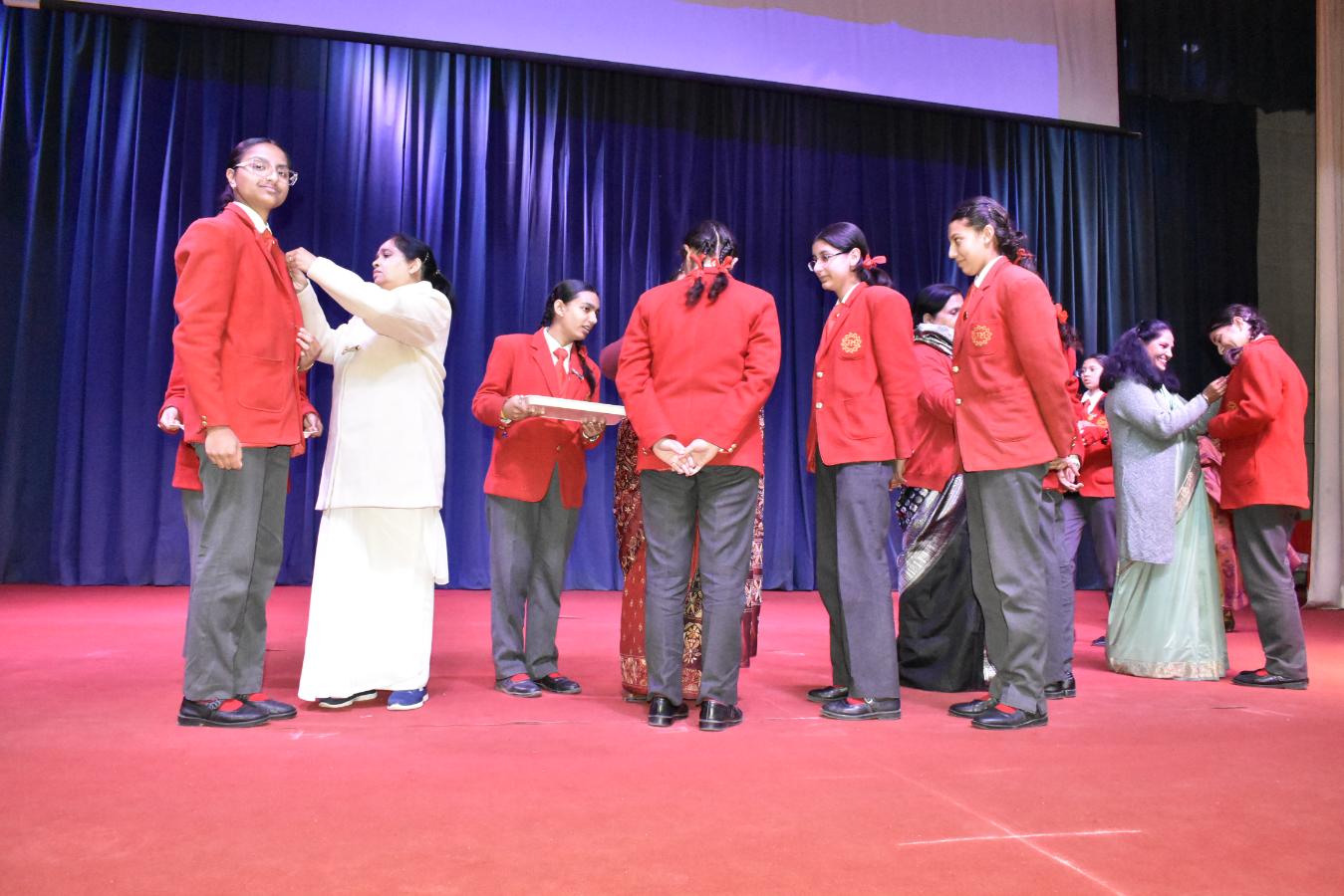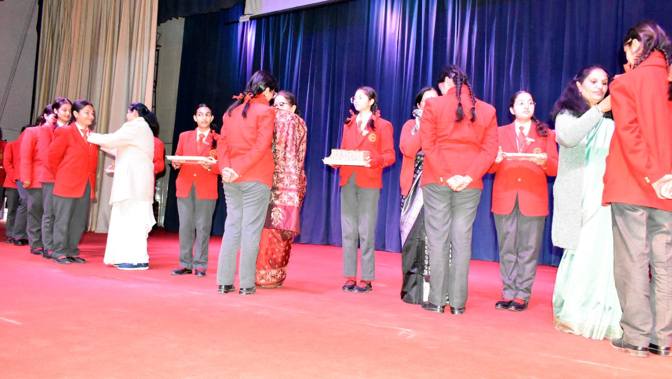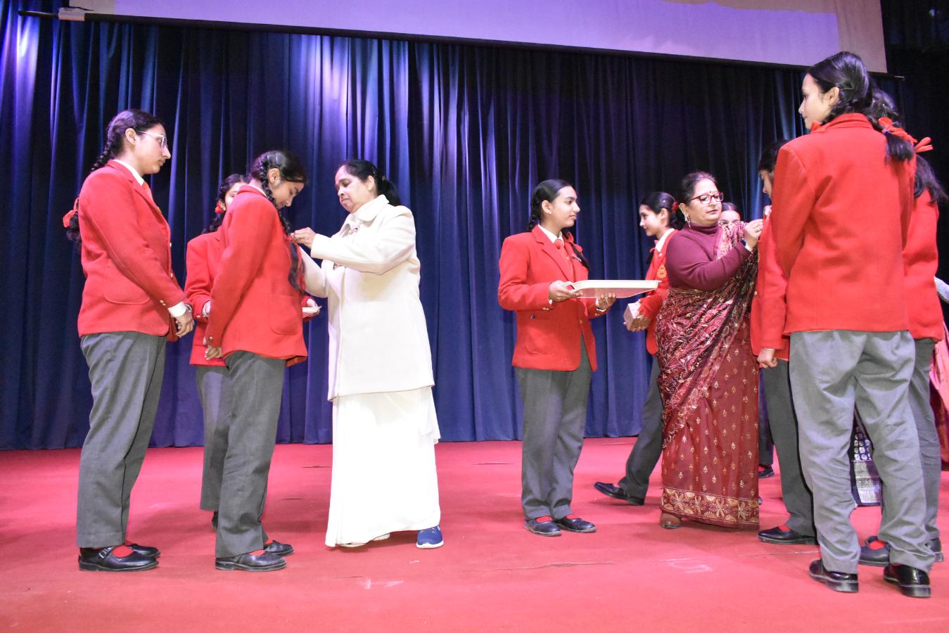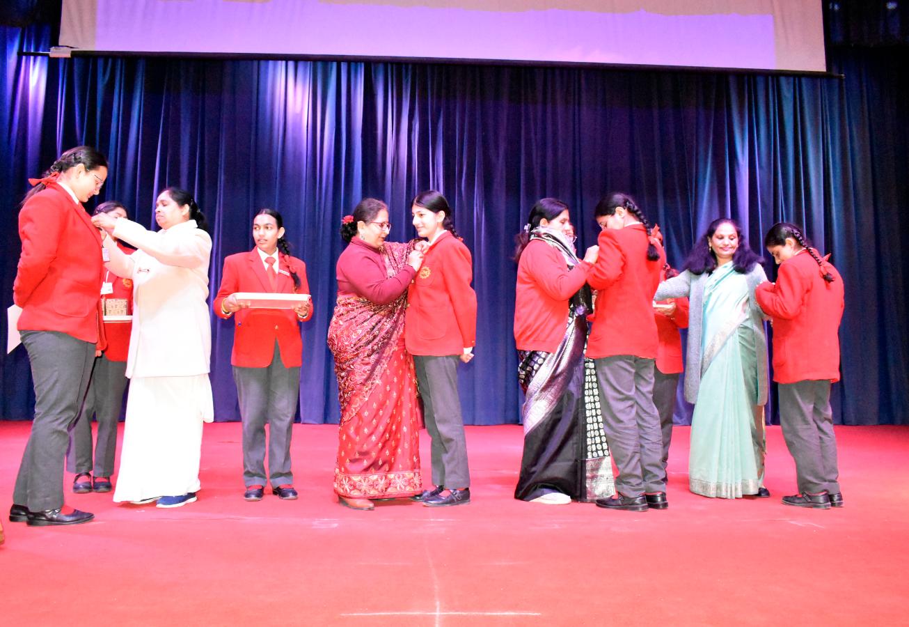 Description: The Laying down Ceremony was held on 21 November. The outgoing Class XII Cabinet handed over their badges and responsibilities to the Principal.