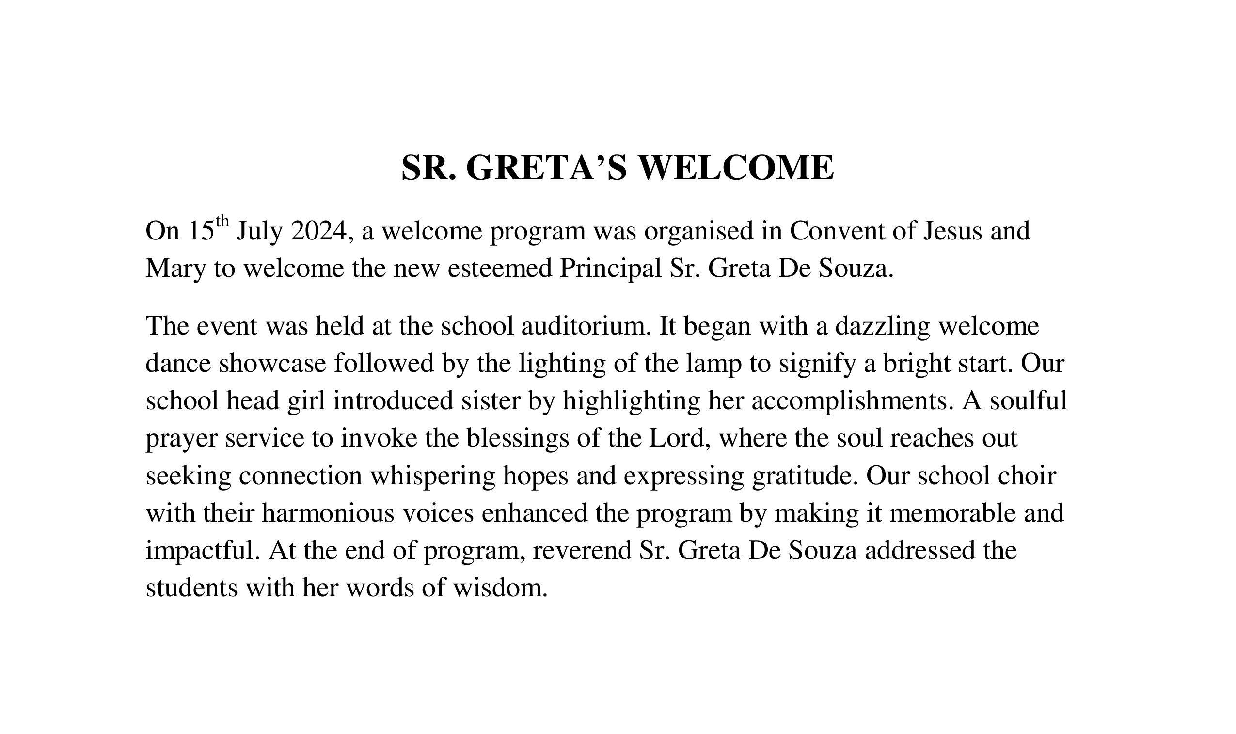 Description: On 15th July 2024, School welcomed our new Principal Sr. Greta De Souza.